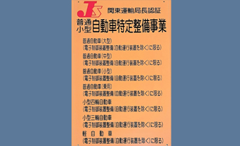 埼玉営業所に掲げてある、こちらの看板は「認証標識」といい、国から許可を受けた特定整備工場に掲げられている看板です。