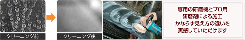 特殊な研磨剤とクリーニング剤を利用し、専用の機械で丁寧に施工することで、視界スッキリのウィンドウを実現します。